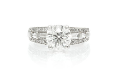 containing one round brilliant cut diamond weighing approximately 2.00 carats, numerous round brilliant cut diamonds weighing approximately 0.36 carat total and four baguette cut diamonds weighing approximately 0.32 carat total.Accompanied by a European Gemological Laboratories International diamond grading consultation number 2208602525, stating Weight: 2.00 carats, Color: H, Clarity: SI2, Cut: Excellent Ideal Cut.