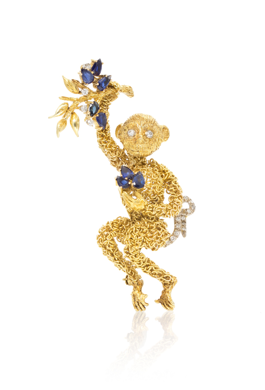 An 18 Karat Yellow Gold, Sapphire and Diamond Brooch in a Monkey Motif,
