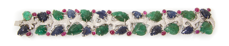 in a Tutti Frutti style, containing 12 carved leaf motif emeralds, 12 carved leaf motif sapphires, 19 round and oval cabochon cut rubies, and numerous round brilliant cut diamonds weighing approximately 2.75 carats total, hidden removable extension link.Stamp: 750.