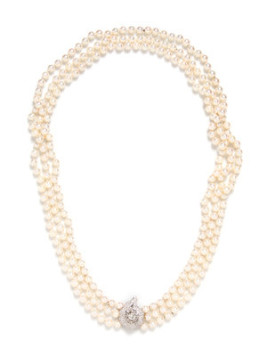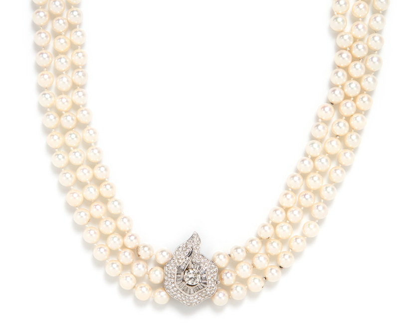 A Triple Strand Cultured Pearl Necklace with White Gold and Diamond Clasp,