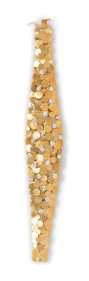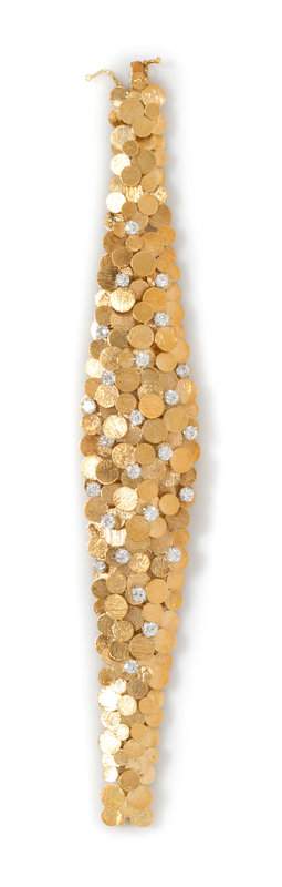 in a tapered design consisting of numerous brushed finish round disks interspersed with 25 prong set round brilliant and old European cut diamonds weighing approximately 3.20 carats total.Stamp: 18K (maker's mark MO within a diamond form border).