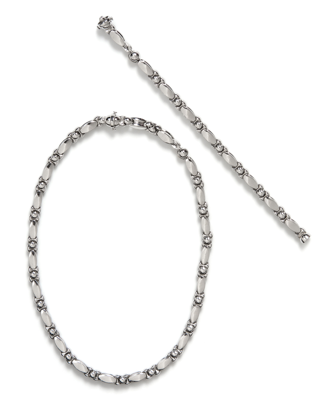consisting of a necklace composed of alternating brushed navette and polished bead links, together with a matching bracelet.Stamp: 750 KISS (Italian maker's mark 898 VI).