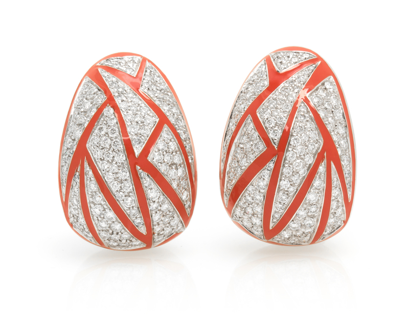 in a domed graduated design, containing numerous round brilliant cut diamonds weighing approximately 2.50 carats total separated by pink orange enamel linear designs.Stamp: 18K.