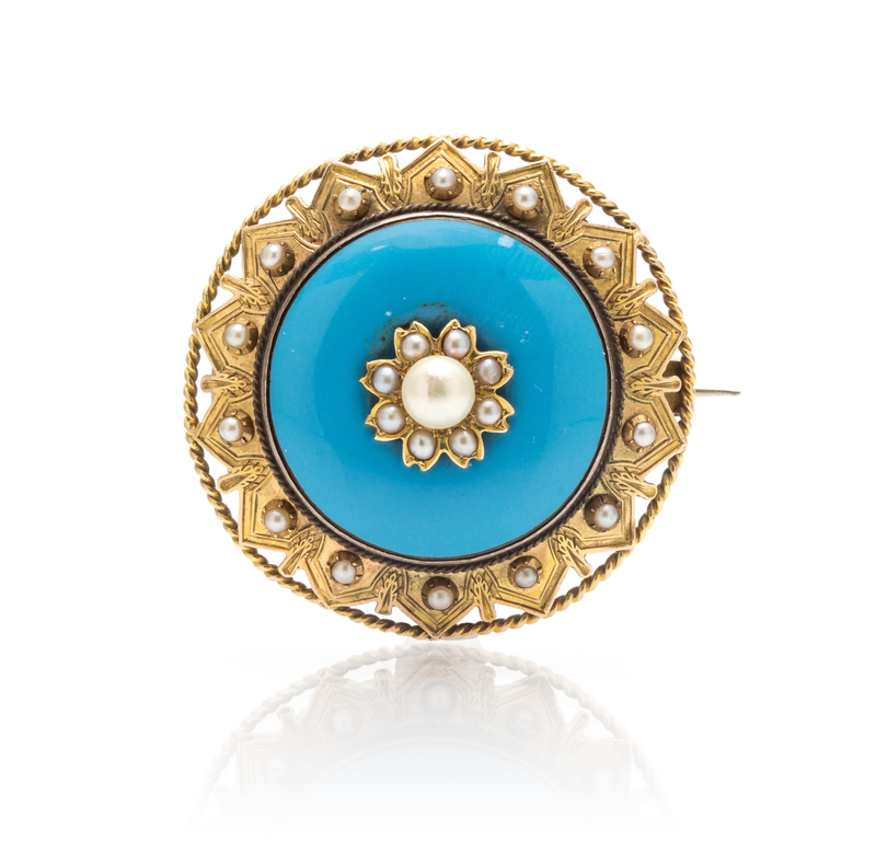 consisting of a central domed enamel section in a turquoise blue color surmounted with a gold cluster containing one pearl measuring approximately 5.70 mm in diameter and eight seed pearls measuring approximately 2.01-2.25 mm in diameter, the enamel plaque set within an openwork rope texture and geometric motif border with seed pearl accents.NOTE: The pearls in this brooch have not been tested for origin.
