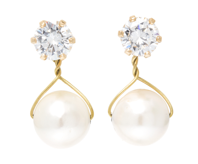 A Pair of Yellow Gold and Diamond Stud Earrings with Detachable Cultured Pearl Pendants,