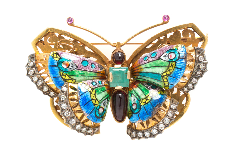 hinged wings mounted en tremblant accented with polychrome champlev enamel, wing open edgework containing 30 round single cut diamonds weighing approximately 0.45 carat total, the thorax and antennae containing one square step cut emerald, two cabochon cut garnets and two round cabochon cut pink sapphires, the reverse of the openwork base plate detailed with intricate hand engraving in a foliate motif.Stamp: (maker's marks).
