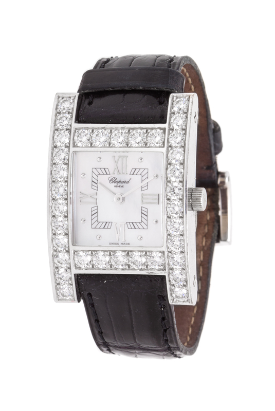 the bezel containing 34 round brilliant cut diamonds weighing approximately 2.72 carats total, the case measuring approximately 36.00 x 25.00 mm, mother-of-pearl dial signed CHOPARD, applied silvered Roman numerals, silvered pencil hands, case back affixed with four screws, quartz movement, black crocodile strap, white gold buckle signed CHOPARD.