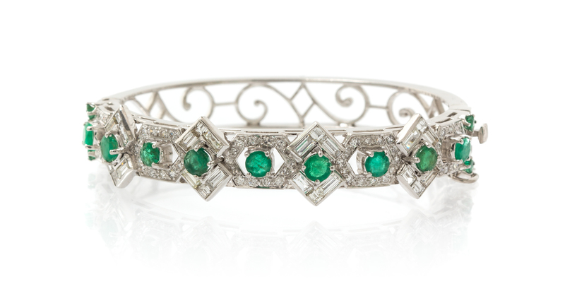 containing 24 baguette cut diamonds weighing approximately 2.54 carats total, numerous single cut diamonds weighing approximately 1.05 carats total and 13 round mixed cut emeralds within an openwork geometric setting with center hinge.