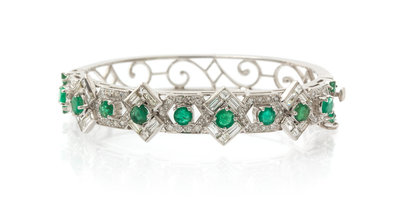 A 14 Karat White Gold, Emerald and Diamond Bangle Bracelet,