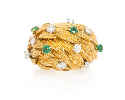 in a textured layered leaf design, containing eight round brilliant cut diamonds weighing approximately 0.73 carat total and four round mixed cut emeralds weighing approximately 0.42 carat total. Stamp: 18Kts. 750.