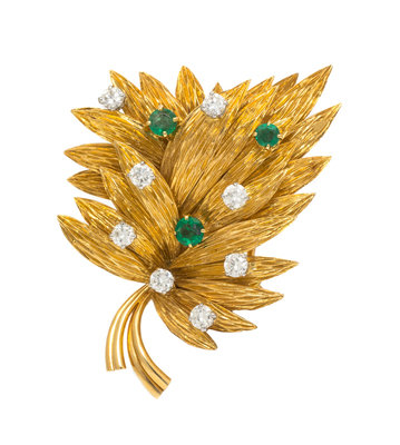 An 18 Karat Yellow Gold, Diamond and Emerald Leaf Brooch, Georges Lenfant,