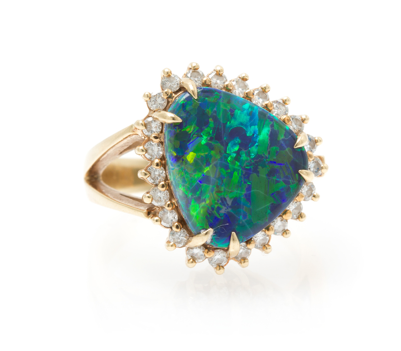A 14 Karat Yellow Gold, Black Opal and Diamond Ring,