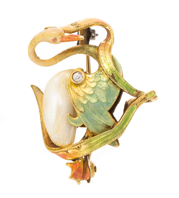 An Art Nouveau Yellow Gold, Pearl, Diamond and Polychrome Enamel Swan Brooch,