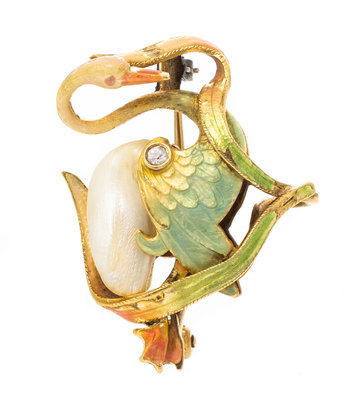 containing one baroque pearl (origin not tested) and one old European cut diamond within an openwork foliate and swan motif gold setting accented with translucent orange, blue and green enamel detail, the reverse engraved with a feathered design.
