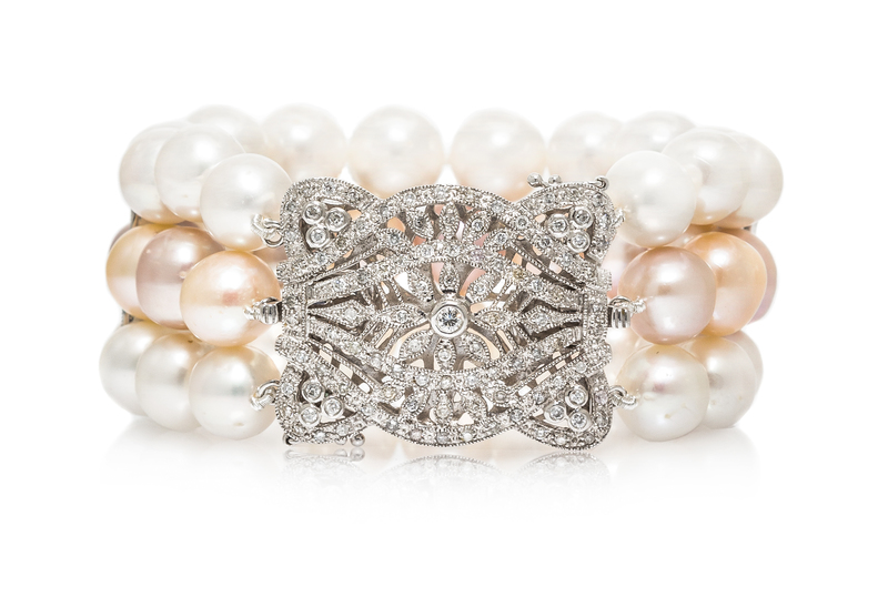 consisting of a triple strand bracelet containing 42 near round and baroque pearls in various hues measuring approximately 9.70-10.85 mm in diameter strung knotted with two spacer bars containing 24 round brilliant cut diamonds weighing approximately 0.12 carat total and a removable openwork clasp with millegrain accents containing 105 round brilliant cut diamonds weighing approximately 1.09 carats total.Stamp: 18K 136.