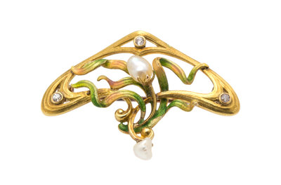 An Art Nouveau 14 Karat Yellow Gold, Polychrome Enamel, Diamond and Pearl Brooch, Carter, Howe & Co.,