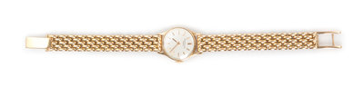 20.0 mm case diameter, matte silvered dial, gilt index numerals, gilt pencil hands, hand wound mechanical movement, snap on case back, crown with embossed Calatrava symbol, later 18 karat yellow gold link bracelet with box clasp.Stamp: (Swiss assay marks).