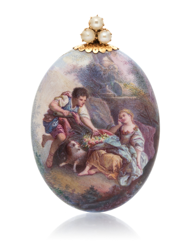 a pastoral scene depicting a youth presenting a basket of flowers to a maiden amidst a forest scene, containing three pearls (origin not tested) measuring approximately 3.40 mm in diameter.