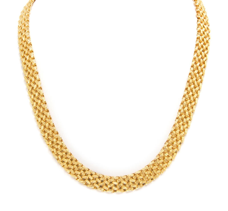 consisting of a textured openwork woven link motif necklace measuring approximately 8.80 mm wide.Stamp: W. GERMANY TIFFANY & CO. 750.