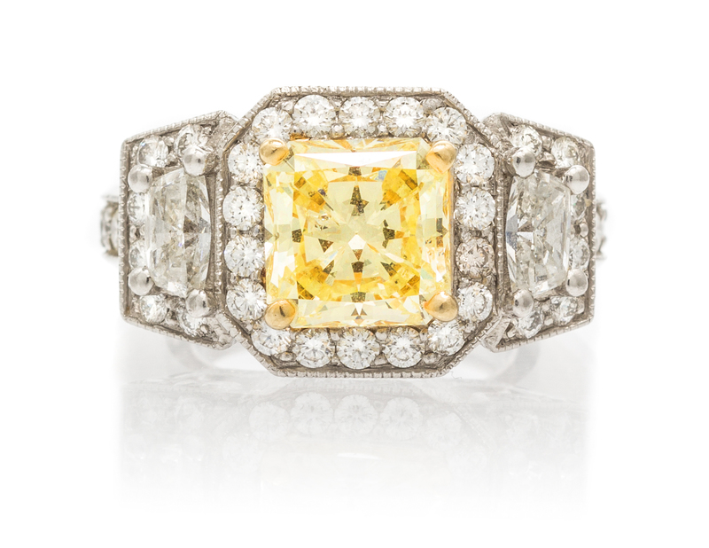 containing one square radiant cut fancy light yellow diamond weighing approximately 3.15 carats, two trapezoid shape mixed cut diamonds weighing approximately 0.83 carat total and 88 round brilliant cut diamonds weighing approximately 1.86 carats total.Stamp: PLAT 18K.