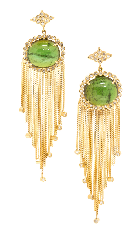 in a dangle design consisting of navette shape tops suspending oval pendants and detachable multi strand tassel accents, containing two oval cabochon cut green tourmaline measuring approximately 16.50 x 14.10 mm and numerous round brilliant cut diamonds weighing approximately 1.30 carats total.Stamp: (Maker's mark).