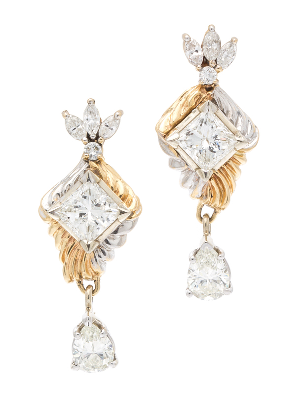 containing two princess cut diamonds weighing approximately 2.90 carats total, two pear shape brilliant cut diamonds weighing approximately 2.46 carats total, six marquise shape brilliant cut diamonds weighing approximately 0.66 carat total and two round brilliant cut diamonds weighing approximately 0.12 carat total.