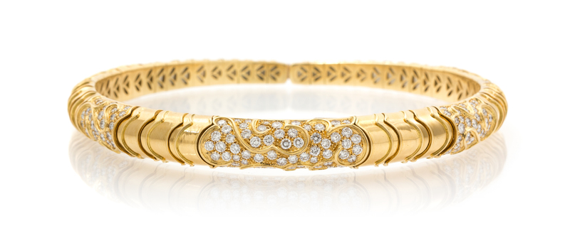 in an interlocking link design over a flexible base, containing numerous round brilliant cut diamonds weighing approximately 14.00 carats total, the stones set in clustered sections accented with raised scrollwork and separated by fluted gold areas.Stamp: 750.