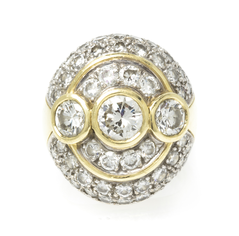 containing one round brilliant cut diamond weighing approximately 1.00 carat, two round brilliant cut diamonds weighing approximately 1.00 carat total and numerous round brilliant cut diamonds weighing approximately 2.38 carats total.Stamp: 18K.