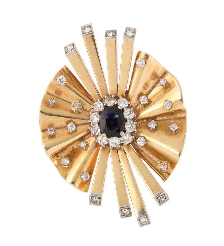 consisting of a fluted yellow gold fan form base with radiating gold bar accents topped with platinum terminals surrounding a central cluster setting, the brooch contains one cushion cut sapphire weighing approximately 1.48 carats and 34 old European, old mine and single cut diamonds weighing approximately 1.50 carats total.Stamp: Trabert & Hoeffer Mauboussin Reflection.