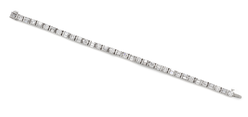 containing 17 round brilliant cut diamonds weighing approximately 4.38 carats total and 34 baguette cut diamonds weighing approximately 2.72 carats total in an alternating pattern.