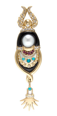 in a stylized Egyptian motif, containing one mabe pearl measuring approximately 13.25 mm, four round cabochon cut turquoise measuring approximately 3.20-3.70 mm, five round cabochon cut rubies weighing approximately 0.40 carat total, two cut onyx plaques, one crescent shape mother of pearl plaque, one rectangular step cut diamond weighing approximately 0.85 carat and numerous round brilliant cut diamonds weighing approximately 1.60 carats total.