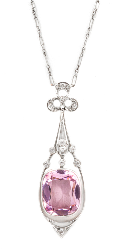 consisting of an openwork pendant containing one cushion cut pink paste center and 12 old European cut diamonds weighing approximately 0.30 carat total, suspended from a platinum link chain.