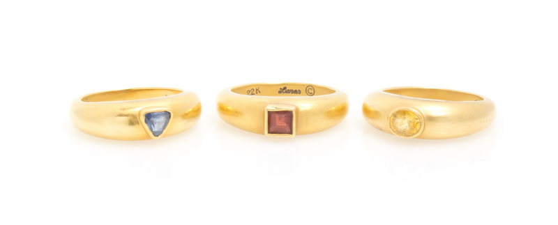 consisting of three rings, one set with a triangular mixed cut sapphire, one set with an oval mixed cut yellow sapphire, and one set with a square mixed cut garnet. Stamp: 18K Luna.