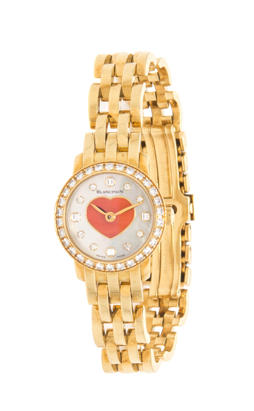 produced in a limited edition of 14, the bezel and dial containing numerous round brilliant cut diamonds weighing approximately 0.70 carat total and four square step cut diamonds weighing approximately 0.08 carat total, the dial comprised of a central orange red coral heart shape within a mother-of-pearl surround and signed BLANCPAIN, diamond set numerals, gold feuille hands, circular case, snap back exhibition crystal, automatic movement with platinum rotor, curved brick link gold bracelet, double deployant clasp.Case back bezel stamp: Ladybird Limited Edition N9/14.Accompanied by an inner case, outer box, book and papers all signed BLANCPAIN.