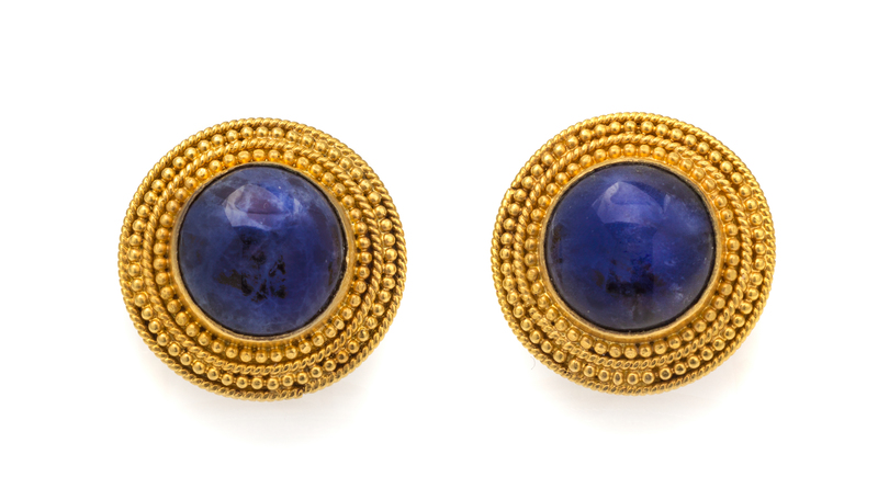 containing two round cabochon cut sodalite within a beaded multi row surround setting.Stamp: ILIAS LALAOUNIS GREECE 750M H17 (maker's mark for Lalaounis).
