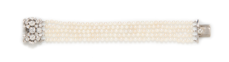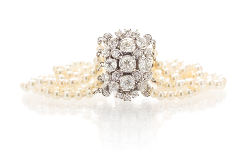 consisting of five strands of pearls (origin not tested) measuring approximately 3.50-3.85 mm in diameter strung knotted with an openwork clasp containing one old mine cut diamond weighing approximately 1.10 carats, four old mine cut diamonds weighing approximately 2.12 carats total and twenty six old European and old mine cut diamonds weighing approximately 1.82 carats total.