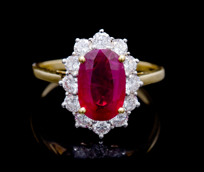 containing one oval mixed cut ruby measuring approximately 12.13 x 7.98 x 4.13 mm and 12 round brilliant cut diamonds weighing approximately 1.20 carats total. Stamp: PT950 750.