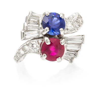 A Platinum, Ruby, Sapphire and Diamond Toi et Moi Ring,