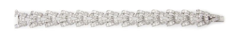 consisting of openwork V shape links, each centrally banded, the bracelet containing numerous round brilliant and single cut diamonds weighing approximately 7.50 carats total.Stamp: TAI PLAT (maker's mark).