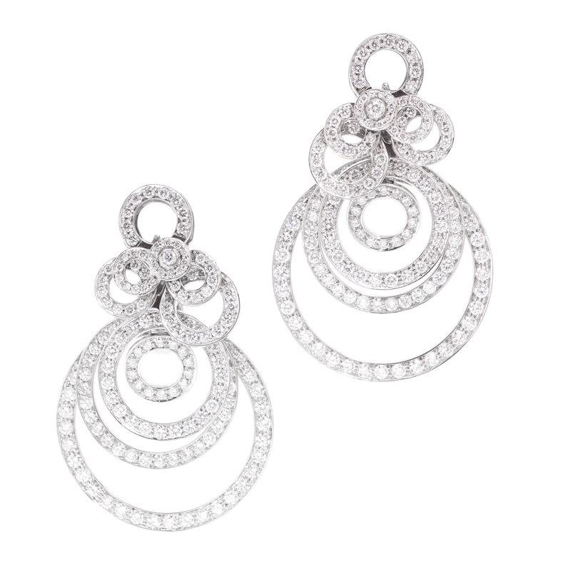 in a graduated and layered multi circlet design containing numerous round brilliant cut diamonds weighing approximately 6.00 carats total, each earclip with two removable circlet pendants and hinged collapsible posts.Stamp: 18K.