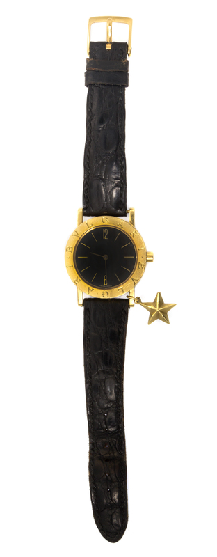 30.00 mm case diameter, black dial, applied gold Arabic and baton numerals, gold baton hands, bezel embossed with BVLGARI, snap on case back, quartz movement, attached gold star charm, black crocodile printed leather band with an 18 Karat Yellow Gold tang buckle.Stamp: BVLGARI QVARTZ BB 30 GL F 8851 FABRIQUE EN SUISSE.Accompanied by a BVLGARI tan pouch, an extra tan leather strap and burgundy patent leather strap.
