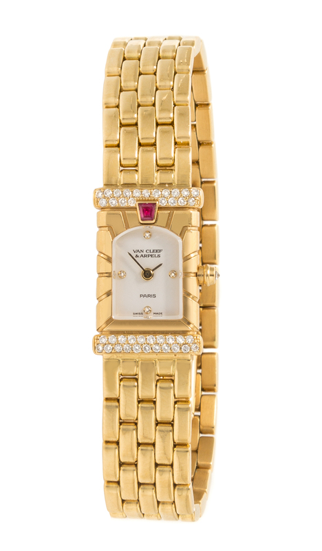 bezel contains 40 round brilliant cut diamonds weighing approximately 0.40 carat total and one trapezoid step cut ruby, 22.00 x 15.00 mm case dimensions, white dial signed Van Cleef & Arpels Paris, diamond dial, diamond numerals, gold pencil hands, quartz movement, integrated brick link bracelet, double deployant clasp.Case back stamp: 18K SWISS 131963 114300 750.Accompanied by an outer box and inner case signed VAN CLEEF & ARPELS, together with a warranty card and one extra link.