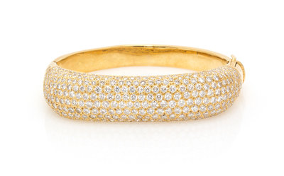 in a domed squared top design, containing numerous pave and bezel set round brilliant cut diamonds weighing approximately 10.00 carats total, hinged with hidden box clasp and safety.