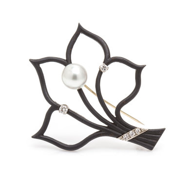 An Art Moderne Blackened Steel, Cultured Pearl and Diamond Brooch, Marsh & Co.,