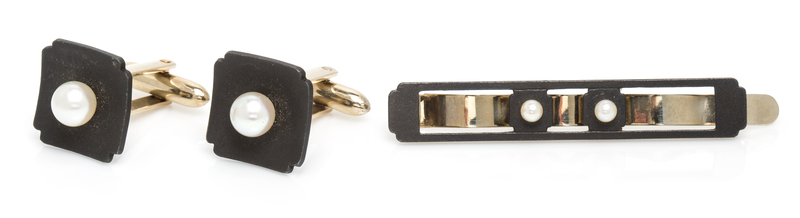 consisting of a tie clip containing two pearls measuring approximately 3.00 mm in diameter, together with a pair of openwork concave design cufflinks containing two pearls measuring approximately 6.00 mm in diameter.Accompanied by an original black case signed MARSH.