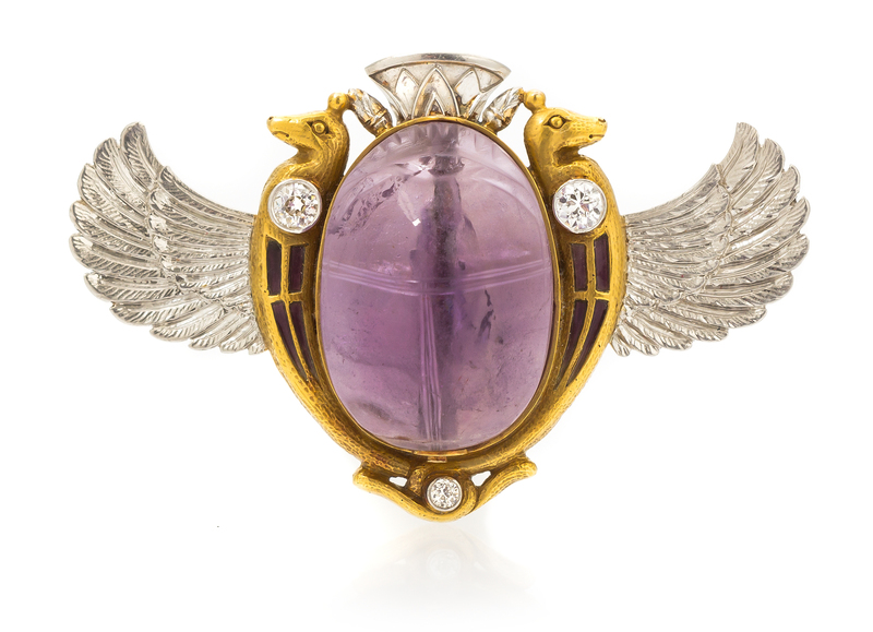 An Egyptian Revival Platinum, Gold, Enamel, Amethyst and Diamond Winged Scarab Brooch,