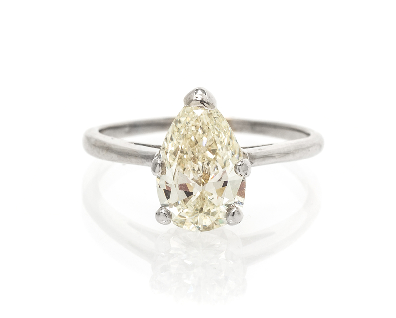 containing one pear shape diamond weighing approximately 2.20 carats.Accompanied by a Gemological Institute of America diamond grading certificate number 5151921745, dated February 6, 2014, stating Color: K, Clarity: SI2, Polish: Very Good, Symmetry: Good, Fluorescence: Very Strong Blue.