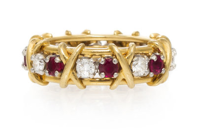 consisting of a gold base accented with gold criss-cross elements and platinum settings containing eight round brilliant cut diamonds weighing approximately 0.70 carat total and eight round mixed cut rubies weighing approximately 1.00 carat total. Stamp: TIFFANY & CO. SCHLUMBERGER 750 PT 950.