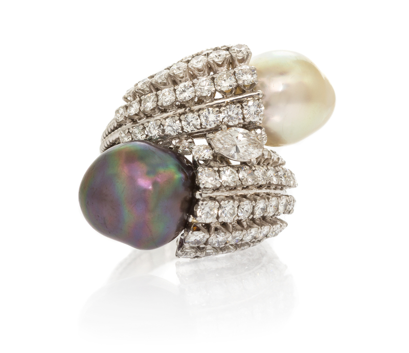 in an openwork bypass design, containing two baroque pearls, one South Sea and one Tahitian, measuring approximately 10.80-12.32 mm in diameter, one marquise cut diamond weighing approximately 0.30 carat and 68 round brilliant cut diamonds weighing approximately 2.38 carats total.