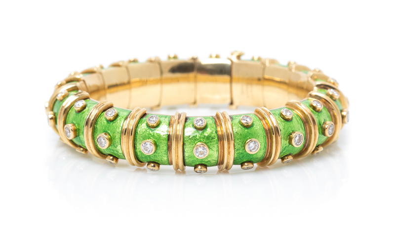 An 18 Karat Yellow Gold, Diamond and Paillonn Enamel Bangle Bracelet, Schlumberger for Tiffany & Co.,